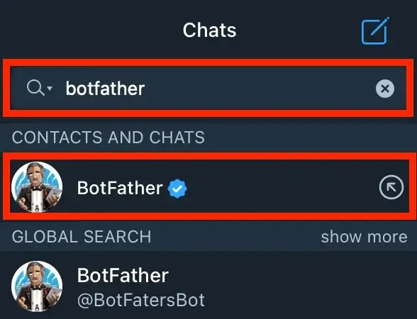 1. 검색창 botfather를 검색한 후 선택합니다.